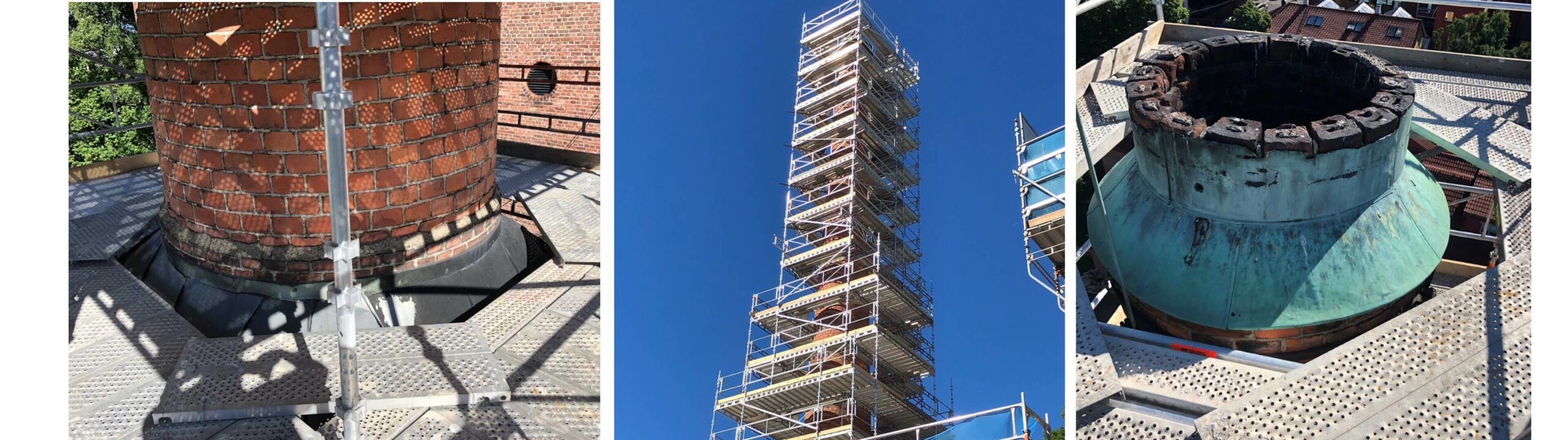 Ved vedlikehold av piper er det viktig med en god arbeidsplattform slik at man kan jobbe effektivt uten risiko for at en selv eller andre ting faller ned og skader ting eller folk under. Vi monterer derfor stillaser fra bakken og opp rundt pipene som skal rehabiliteres og pakker dem inn med duk eller presenning om nødvendig.