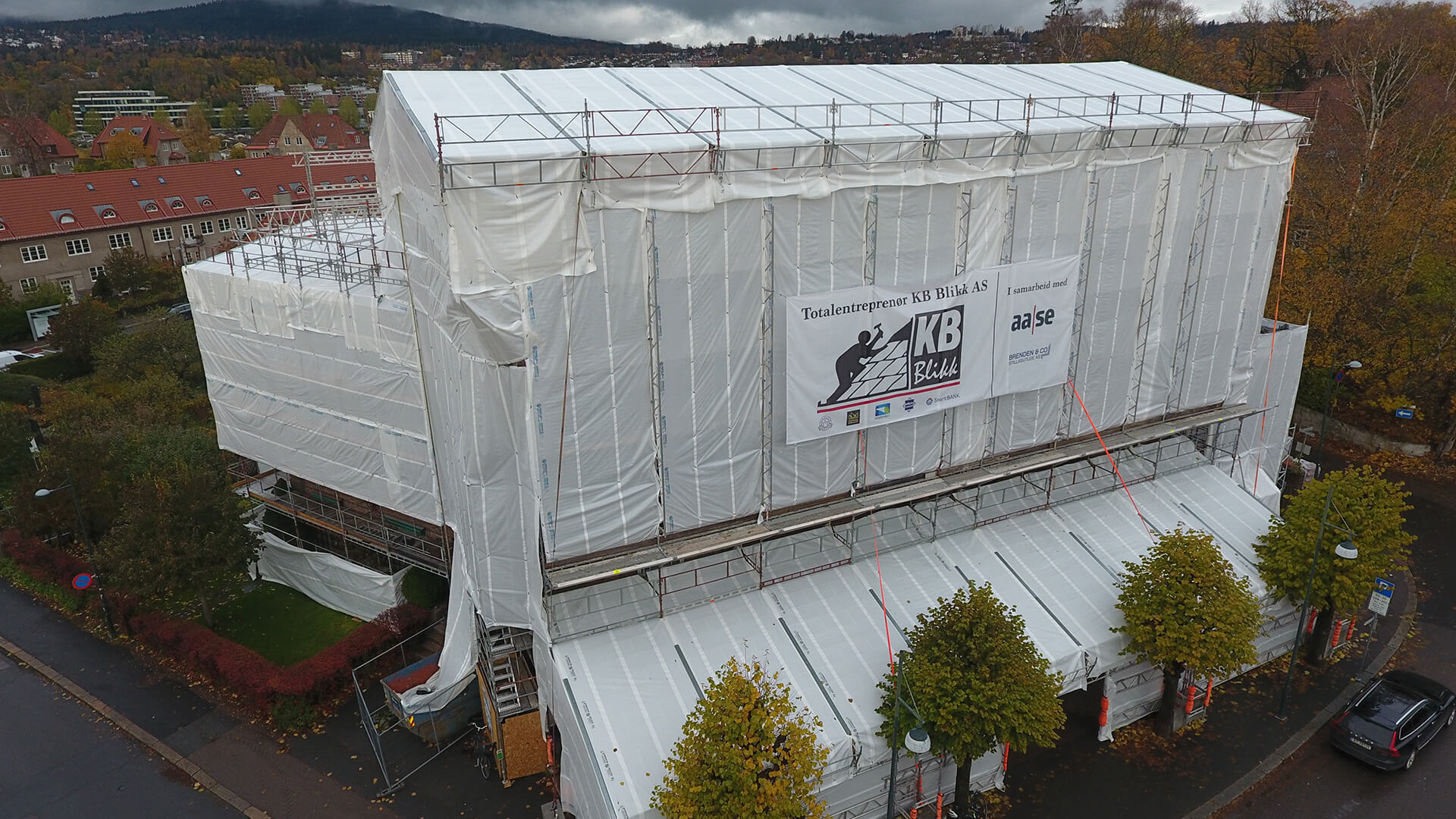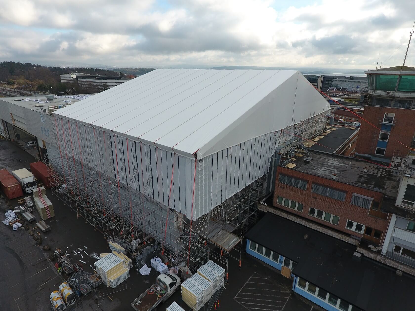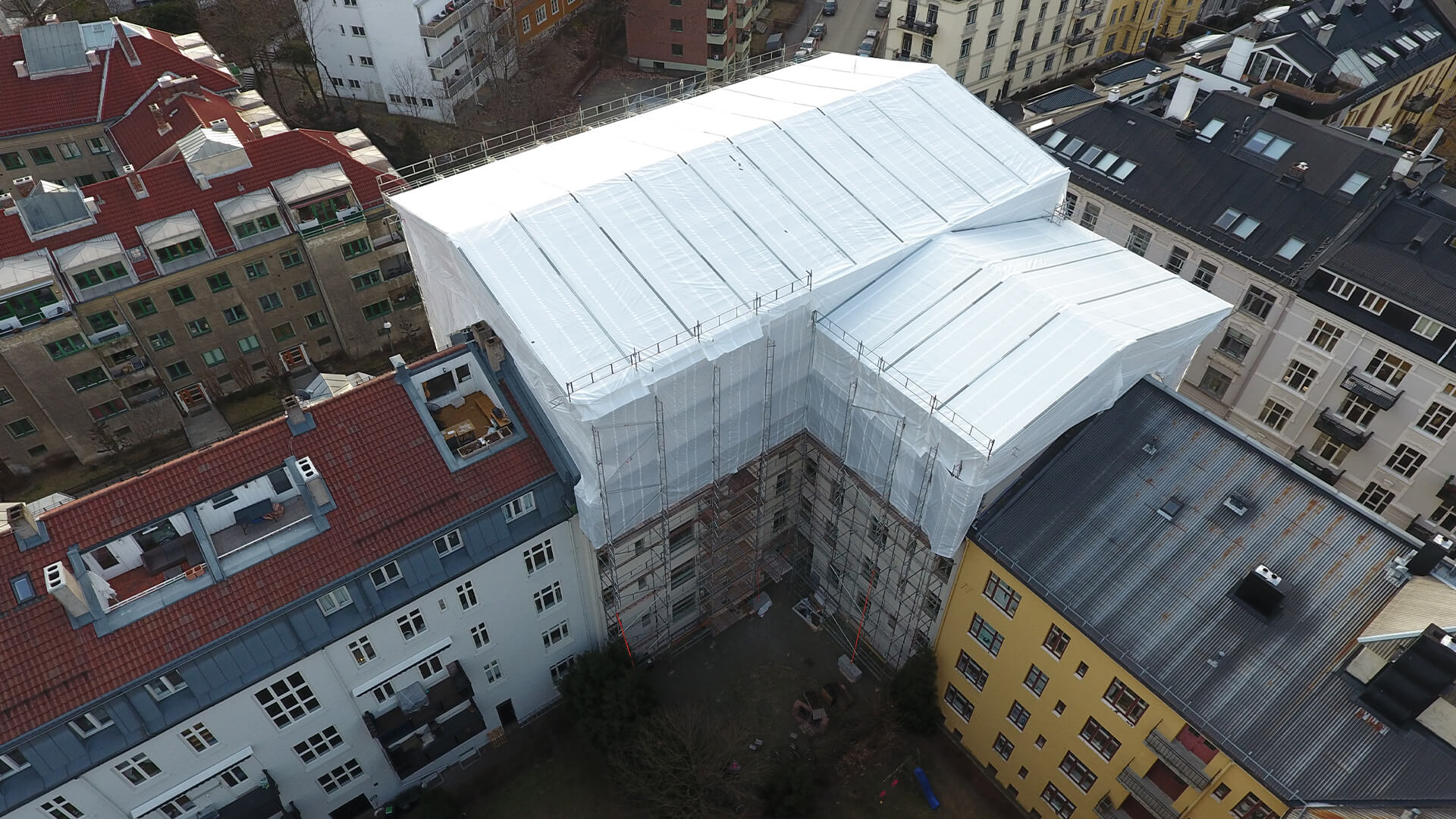 Med takoverbygg og presenning rundt hele stillaset får man et tørt arbeidsmiljø på innsiden av stillaset, da kan man jobbe uavhengig av vær og vind. Dette kan i mange tilfeller gi dramatisk økt effektivitet på prosjektet som igjen gir høyere avkastning og økt byggekvalitet på grunn av tørre forhold.