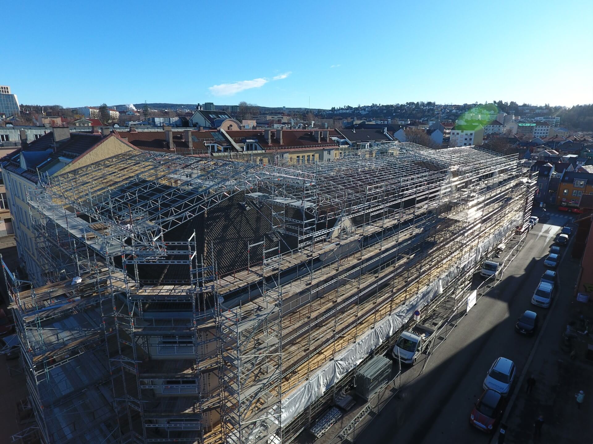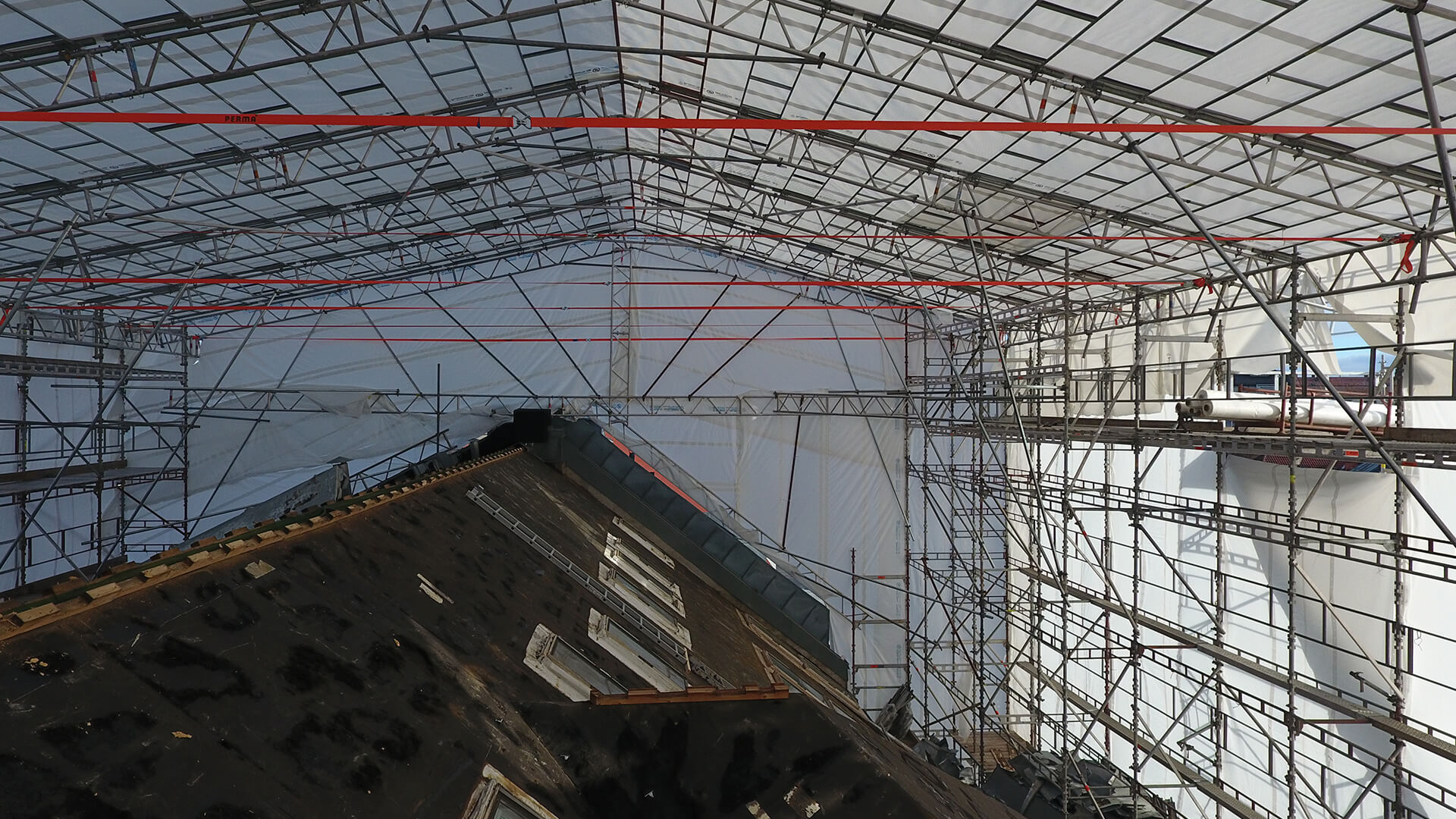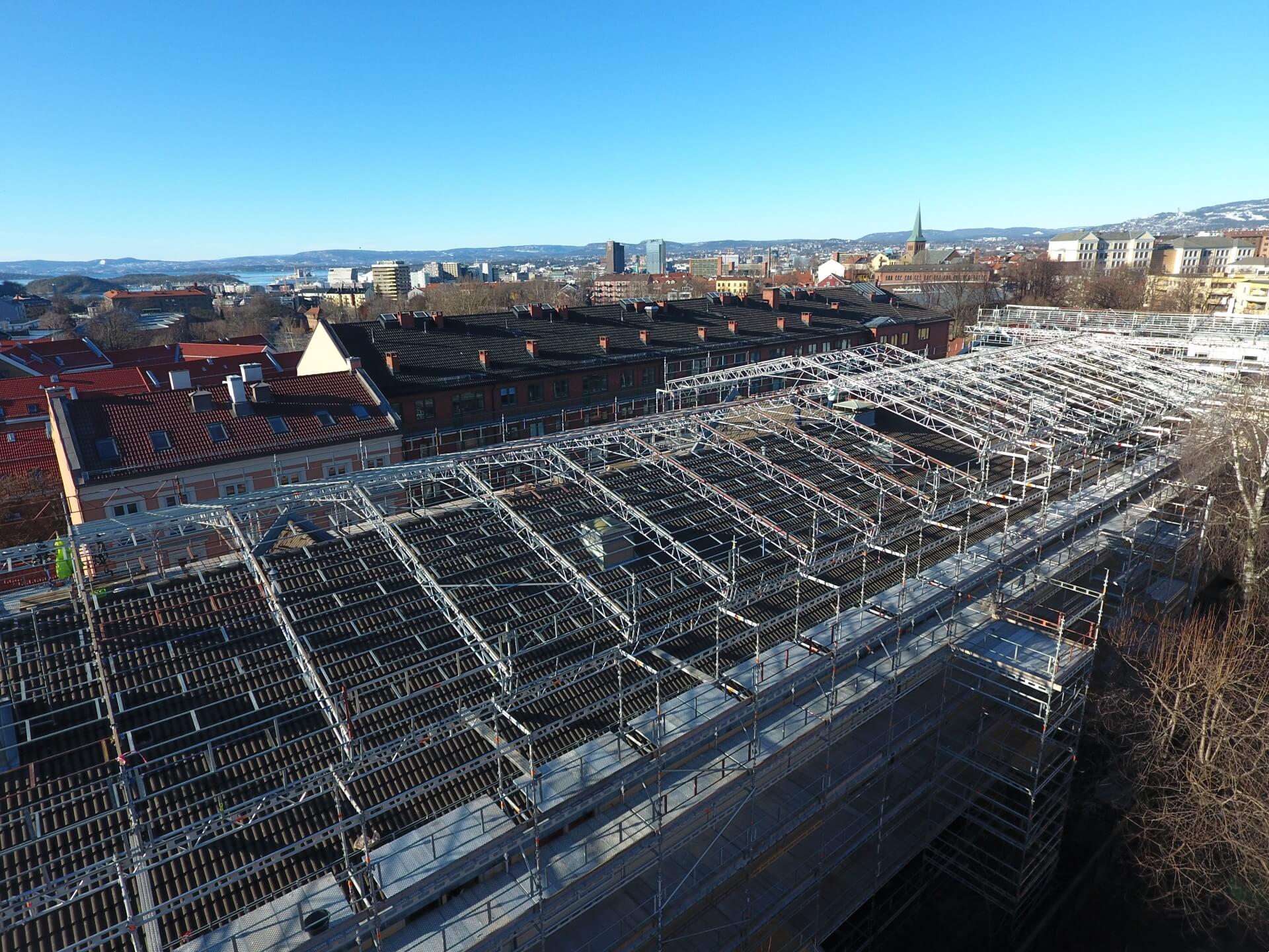 Man har ofte presenning rundt hele bygningen når man har takoverbygg. Det blir derfor store områder med plastikk som vil i tillegg til å holde regn og snø ute også fungere som store segl i vinden. Under storm og lignende forhold kan stillaset og takoverbygget være påvirket av ekstremt sterke krefter. Som en sikkerhet har vi derfor vindvakter som kjører rundt og sjekker stillasene under slike forhold. Vi sjekker da at stillaset og presenningen er hel og gjør tiltak om det skulle være behov slik at vi minimerer sjansen for skader.